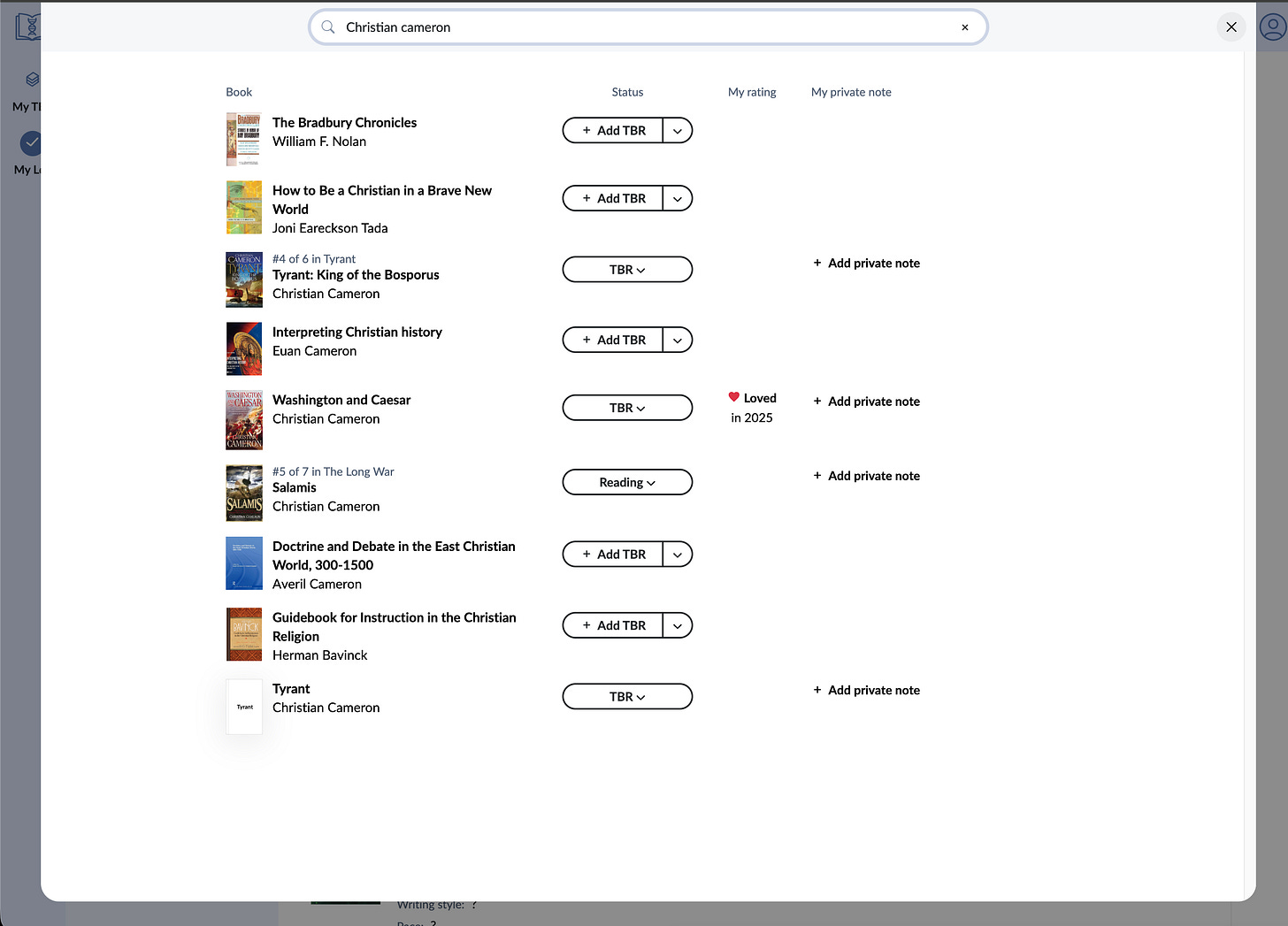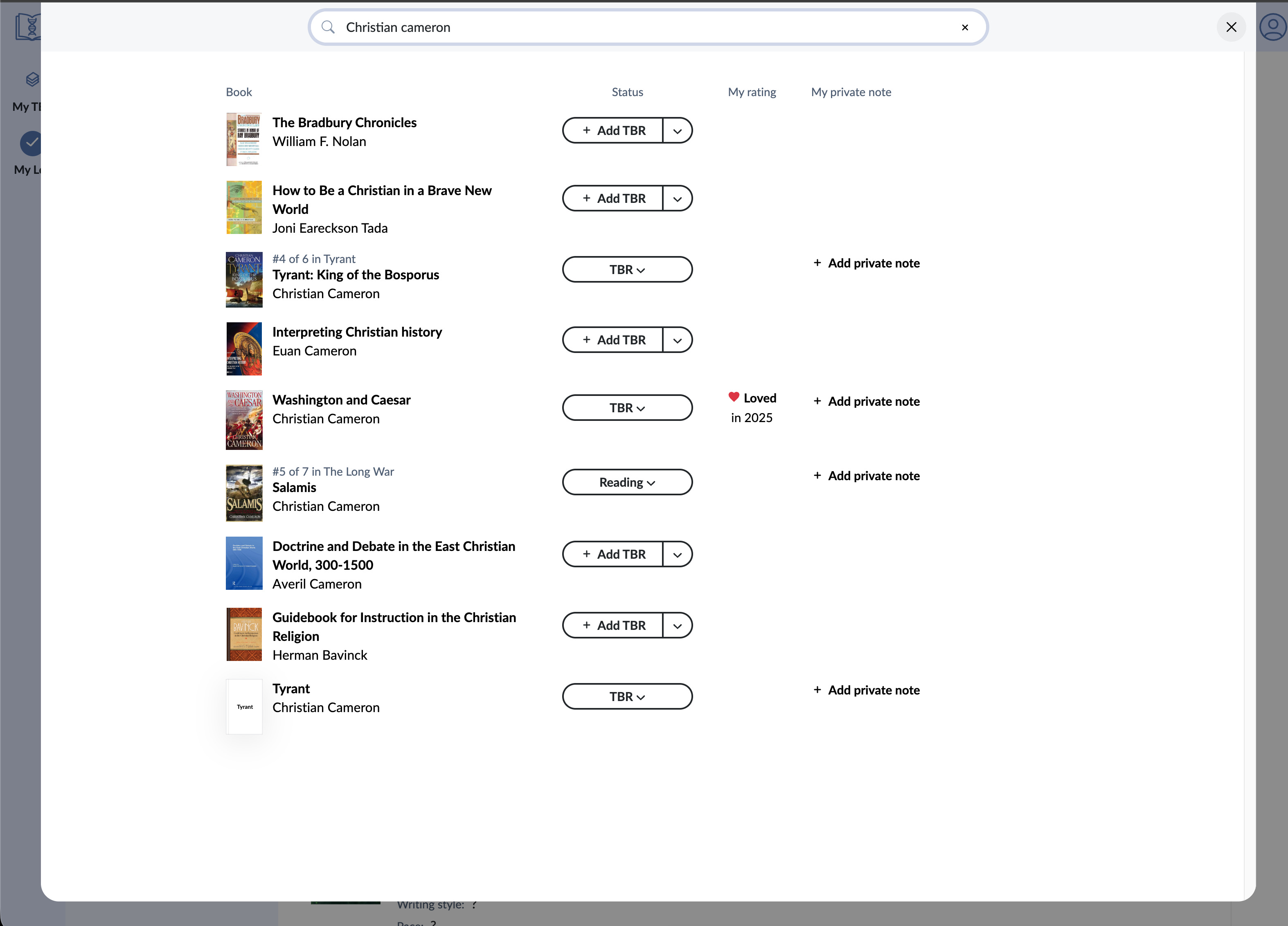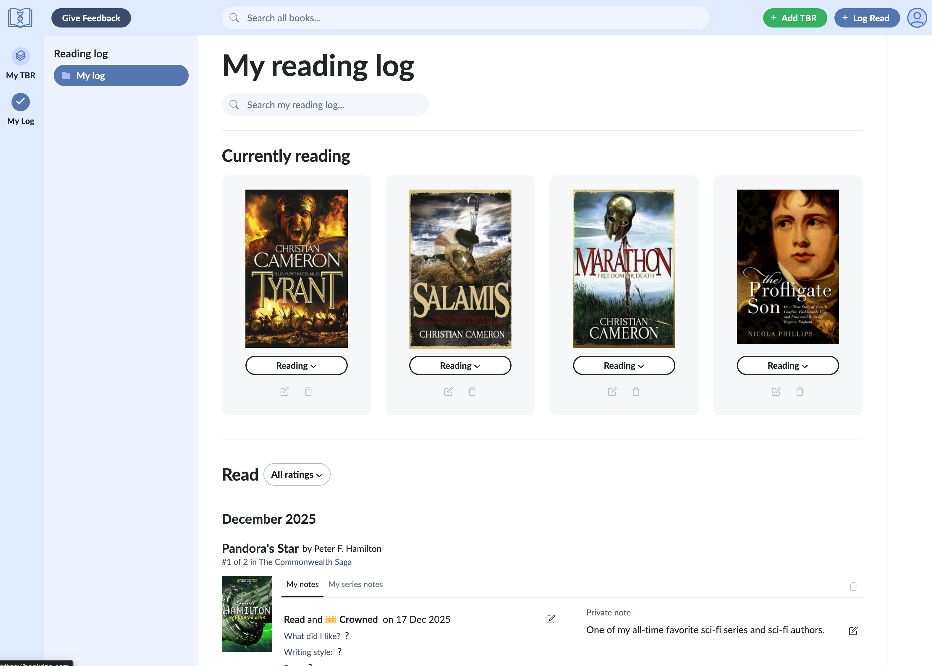 The TBR (to-be-read) section, where you can add what you want to read next. You can add private notes, add a book to your “read next” queue, and see what other books you have read from that author/series. Plus, some simple sorting and keyword filtering of this list.