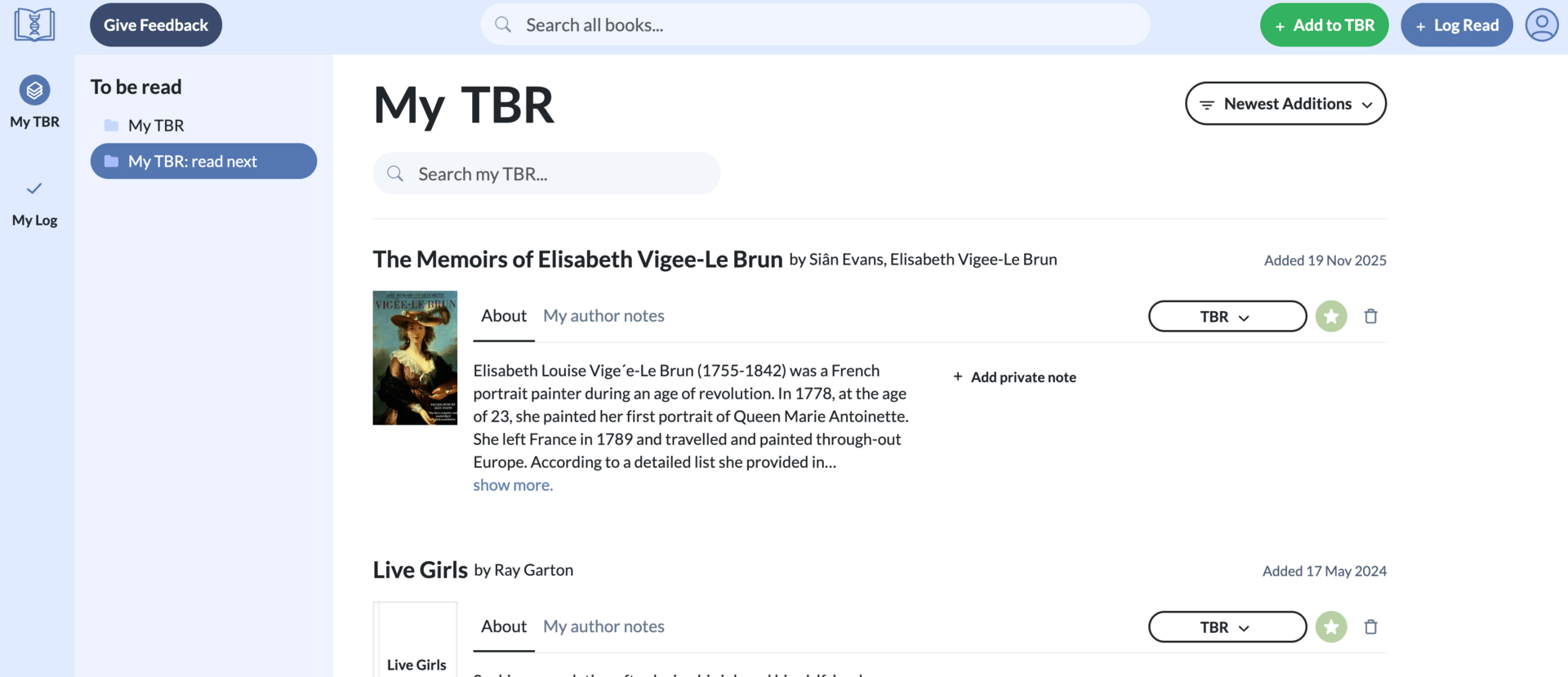 The TBR (to-be-read) section, where you can add what you want to read next. You can add private notes, add a book to your āread nextā queue, and see what other books you have read from that author/series. Plus, some simple sorting and keyword filtering of this list.